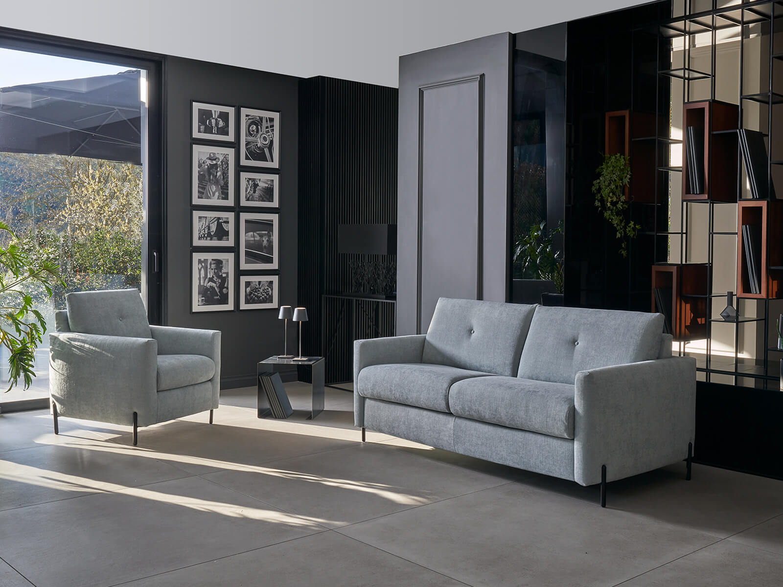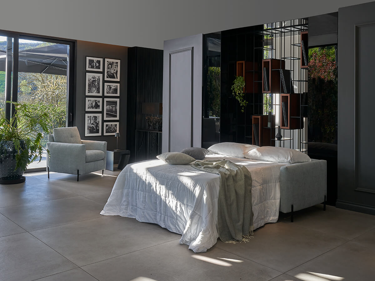 Brio è il divano che nessuno immaginerebbe anche come letto e che come letto è capace di regalare atmosfere e relax sorprendentemente avvolgenti, grazie anche al materasso alto 17 cm. Le sue linee studiate – eleganti e allo stesso tempo vivaci e attuali – si fanno notare fin nell’ultimo particolare: il piedino metallico che è parte del bracciolo.
