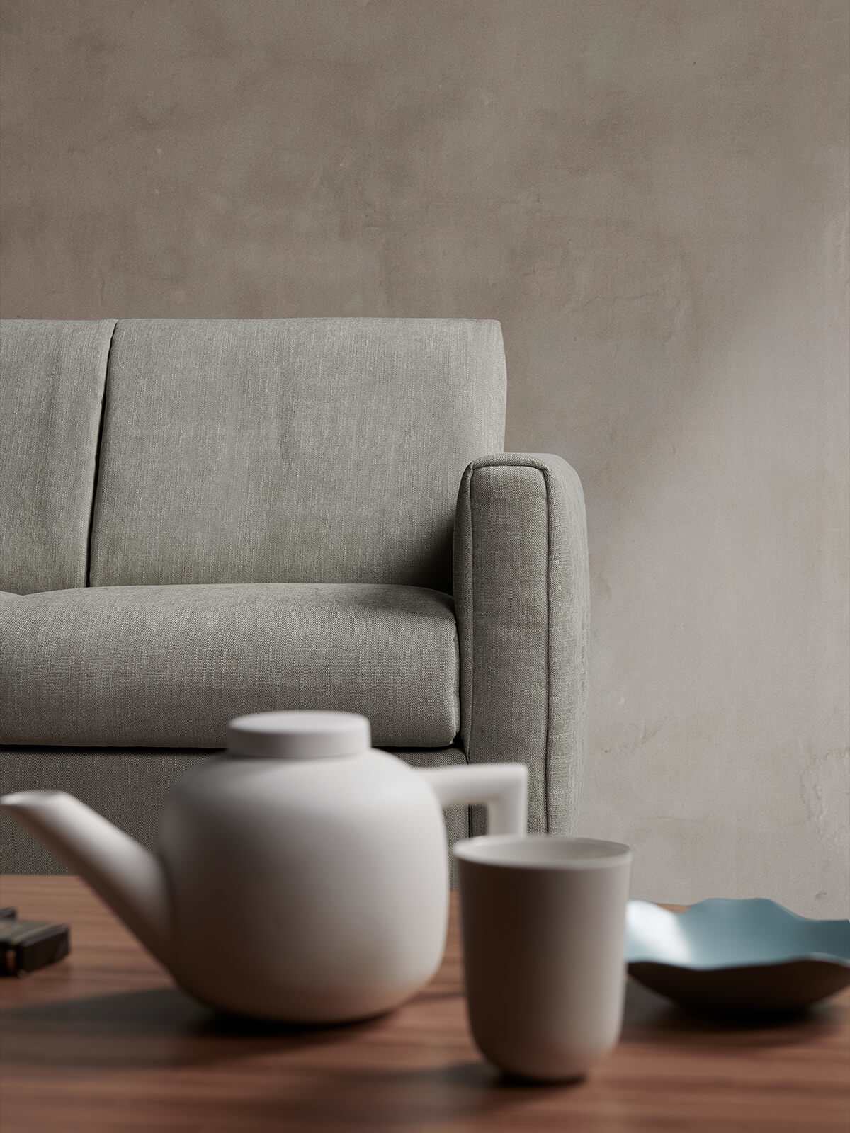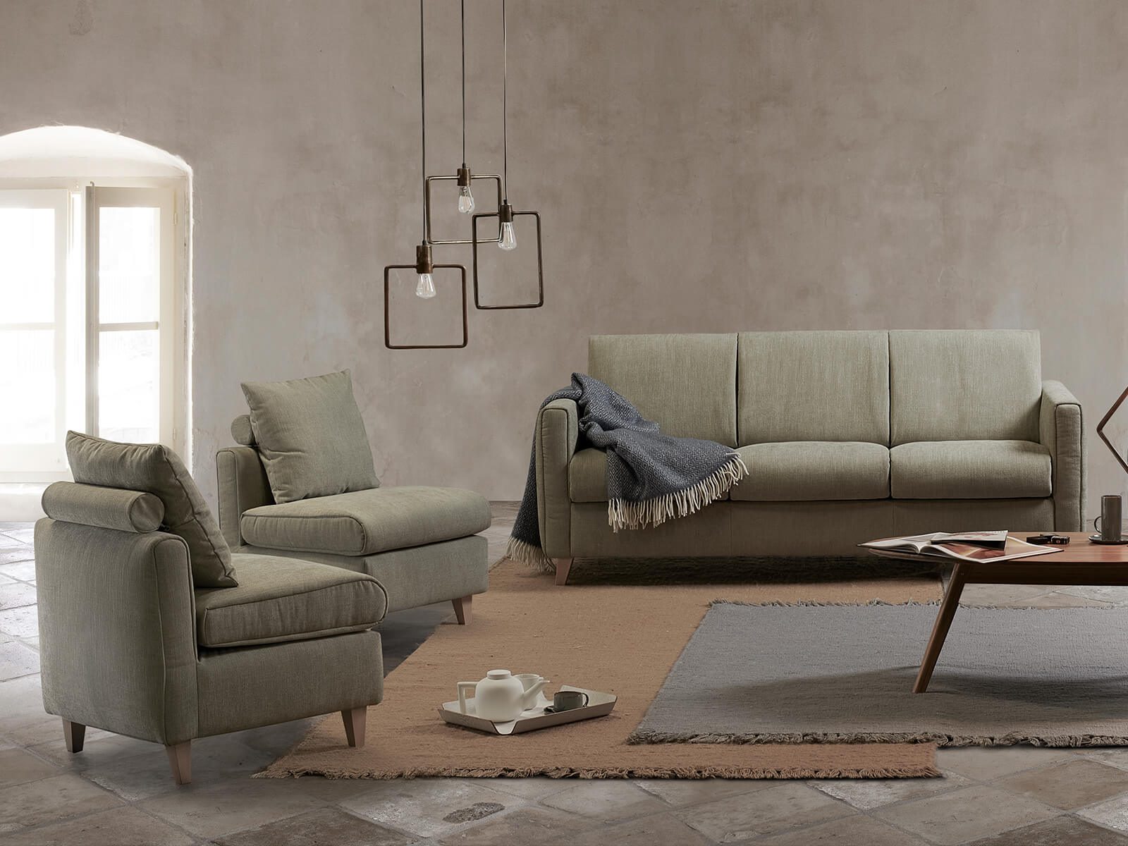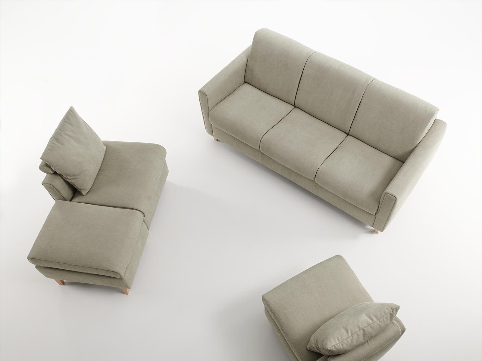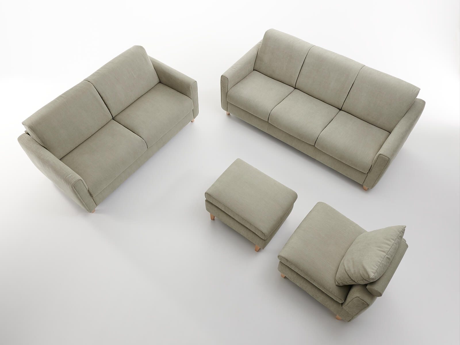 Italo è disponibile con piedini in faggio naturale o wenghé. Disponibile in tessuto, completamente sfoderabile.